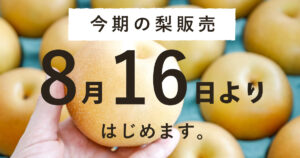 今季の梨販売終了のお知らせ 2025 5/21 販売情報 2025年2月24日2025年5月21日 今季の梨販売は終了いたしました。 販売情報 梨販売開始のお知らせ 関連記事 梨販売開始のお知らせ 2025年2月12日